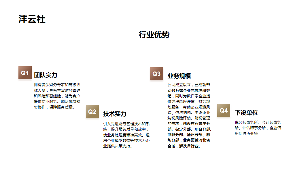 衡水沣云社财务管理有限公司成立于 2008 年 3 月,是河北省全域覆盖的大型企业财税综合服务解决方案供应商。公司下设税务师事务所、会计师事务所、评估师事务所及企业信用协会,以 “体检式风险管控” 为服务理念,业务覆盖石家庄、保定、邢台、邯郸、沧州、廊坊等河北全域,深耕各行业企业服务。 成立至今,已成功助力数万家企业完成注册登记,为数百余家企业提供纳税风险评估与财务规划服务,使命是帮助企业合规避险、依法纳税,持续创造价值。
